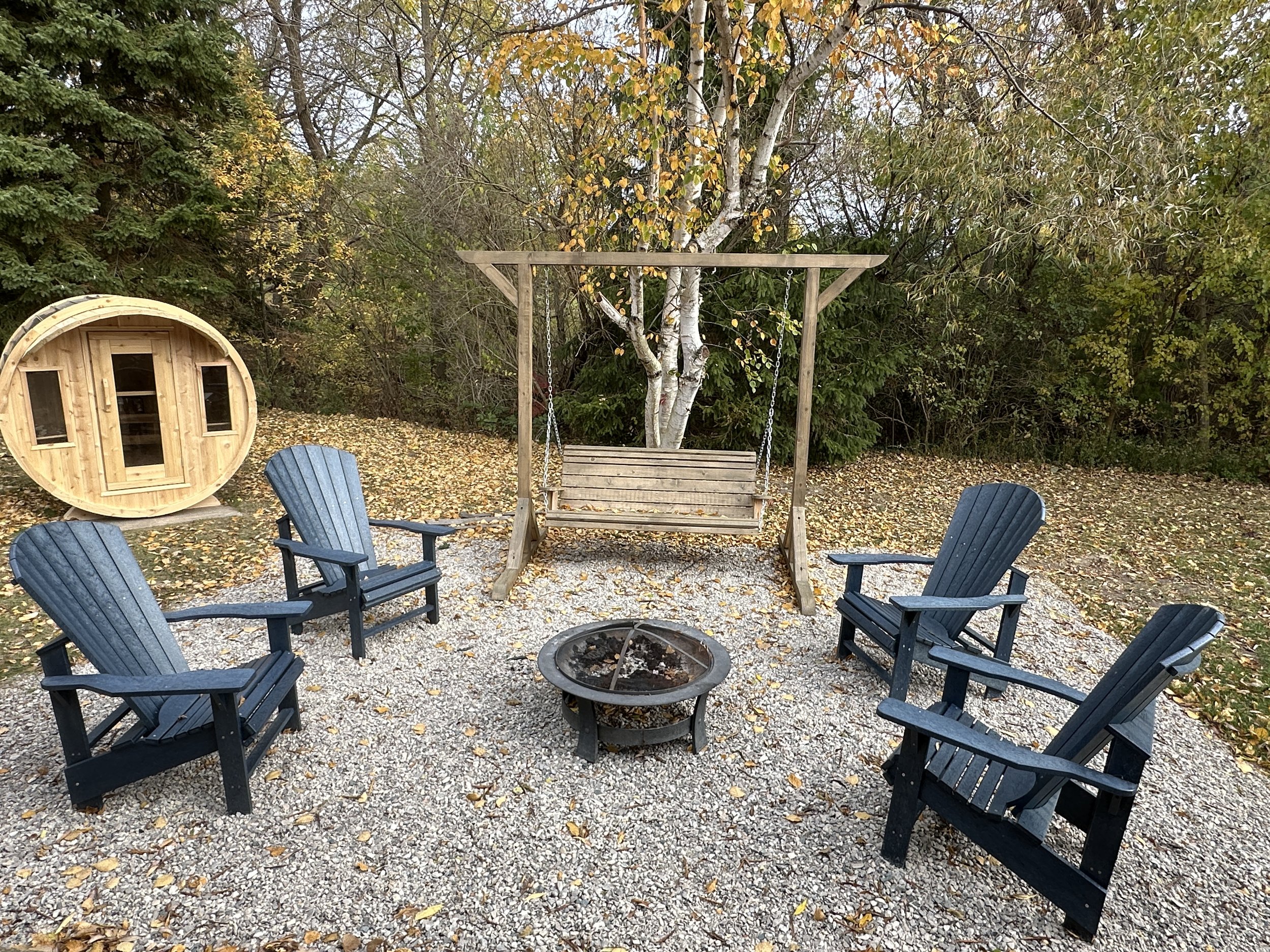 The backyard features a raised firepit surrounded by 4 composite muskoka chairs and wooden bench swing (spring to fall only). Marshmallow roasting sticks provided.